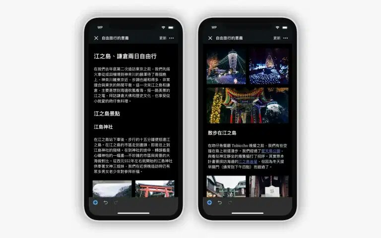 用過 Gutenberg 古騰堡後網誌效率高很多!因為寫旅行文章,很多時候是在旅途中或是平日空擋等候時間紀錄和寫下想法,行動 app 讓我隨時隨地都可以編輯文章。行動古騰堡簡化了移動文章段落重新排序的步驟,讓文章的架構變得很清楚,也更容易管理。